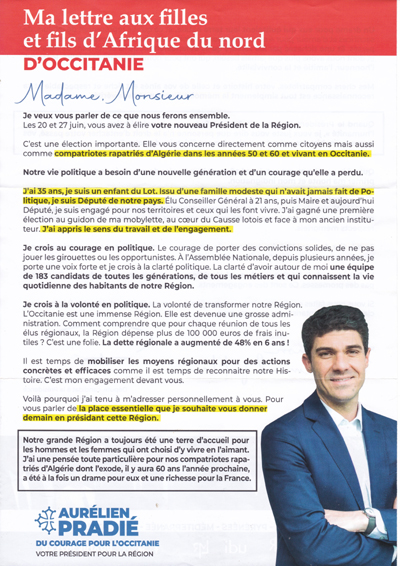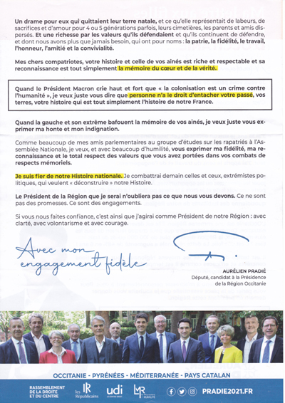 Un "gaulliste" qui drague les Pieds-Noirs: cherchez l'erreur ! source : Tract d’Aurélien Pradié (Elections régionales 2021) |
